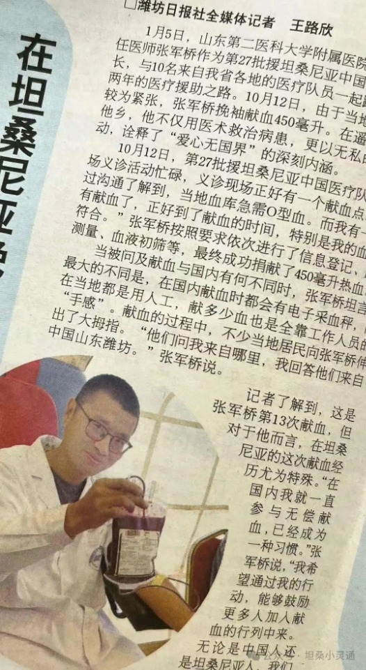 今年3月的报道,记录了张军桥作为第27批援坦桑尼亚中国医疗队队长,也是山东第二医科大学附属医院麻醉科副主任医师,在坦桑尼亚救助当地人民,培养当地医生。