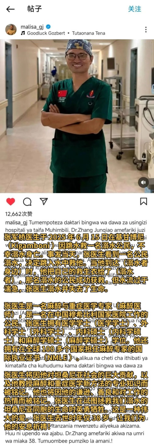 张医生在现场发现一位坦桑尼亚女性落水后,毫不犹豫跃入海中施救,并将自己的救生衣让给落水者,成功将其托举上岸,但自己却因体力不支被水流卷走,不幸牺牲。