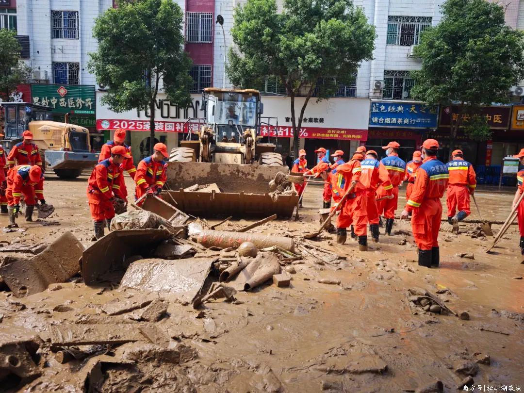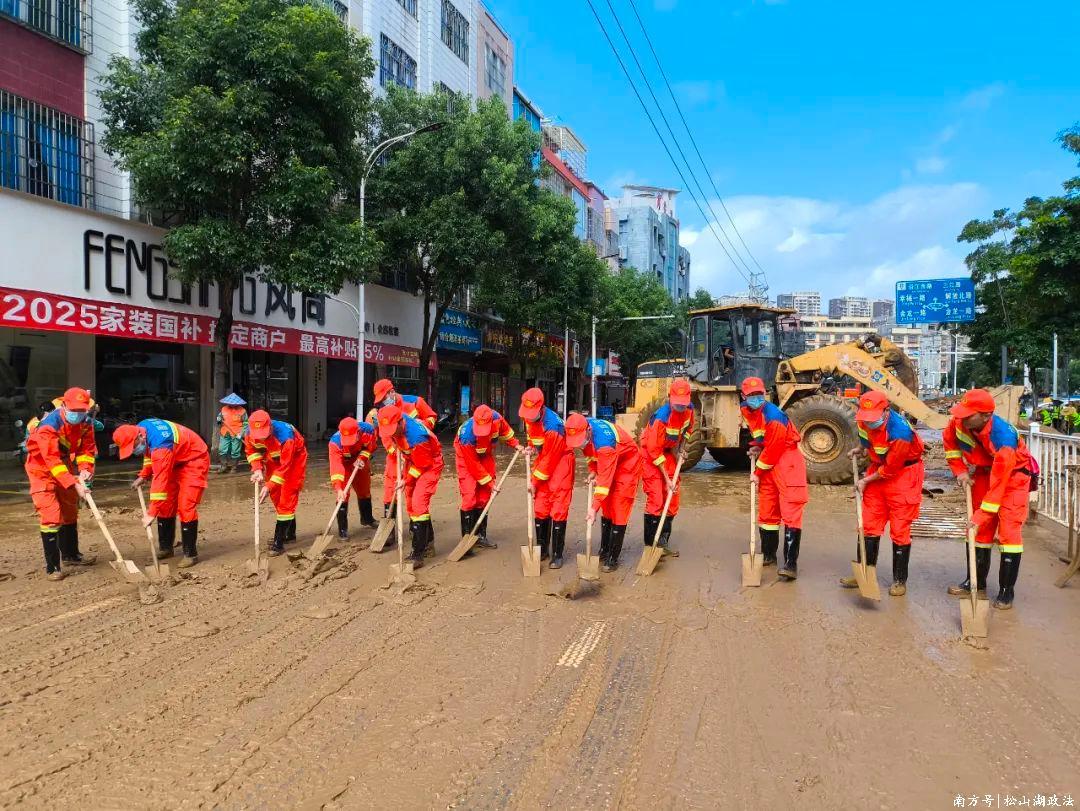 此时的怀集县,受台风“蝴蝶”影响,城区内涝严重,大量淤泥和杂物堆积在街道上,多条主干道被迫中断,居民的生活和出行受到极大影响。面对半米深、散发刺鼻气味且夹杂尖锐物品的淤泥,松山湖“蓝鲲”水域救援专业队毫不退缩,队员们纷纷挽起裤脚、拿起工具齐心协力开展排涝清淤,累计清理受灾区域淤泥、垃圾等障碍物36400㎡,全力保障受灾群众尽快恢复生产生活。