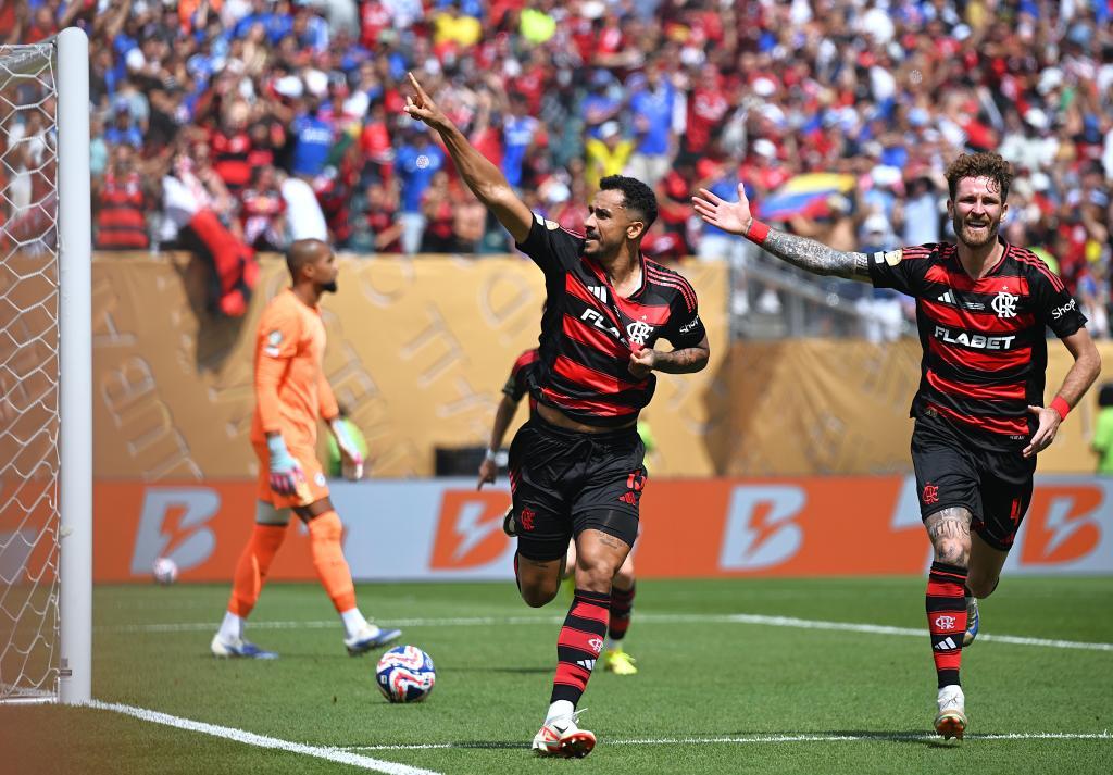 6月20日,弗拉门戈队球员达尼洛(中)进球后庆祝。新华社记者 吴晓凌 摄