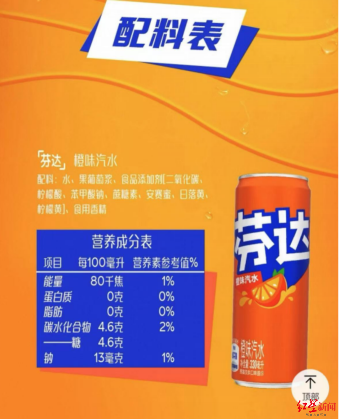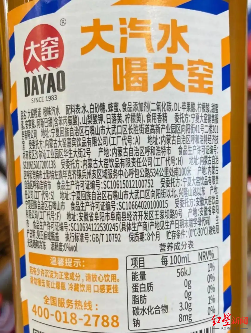 记者对比了可口可乐公司旗下类似产品“芬达”橙味汽水,其配料为:水、果葡糖浆、食品添加剂【二氧化碳、柠檬酸、苯甲酸钠、蔗糖素、安赛蜜、日落黄、柠檬黄】、食用香精。相对来说,“芬达”橙味汽水配料比大窑橙味汽水配料更简单,没有甜蜜素、阿斯巴甜,使用了蔗糖素替代。