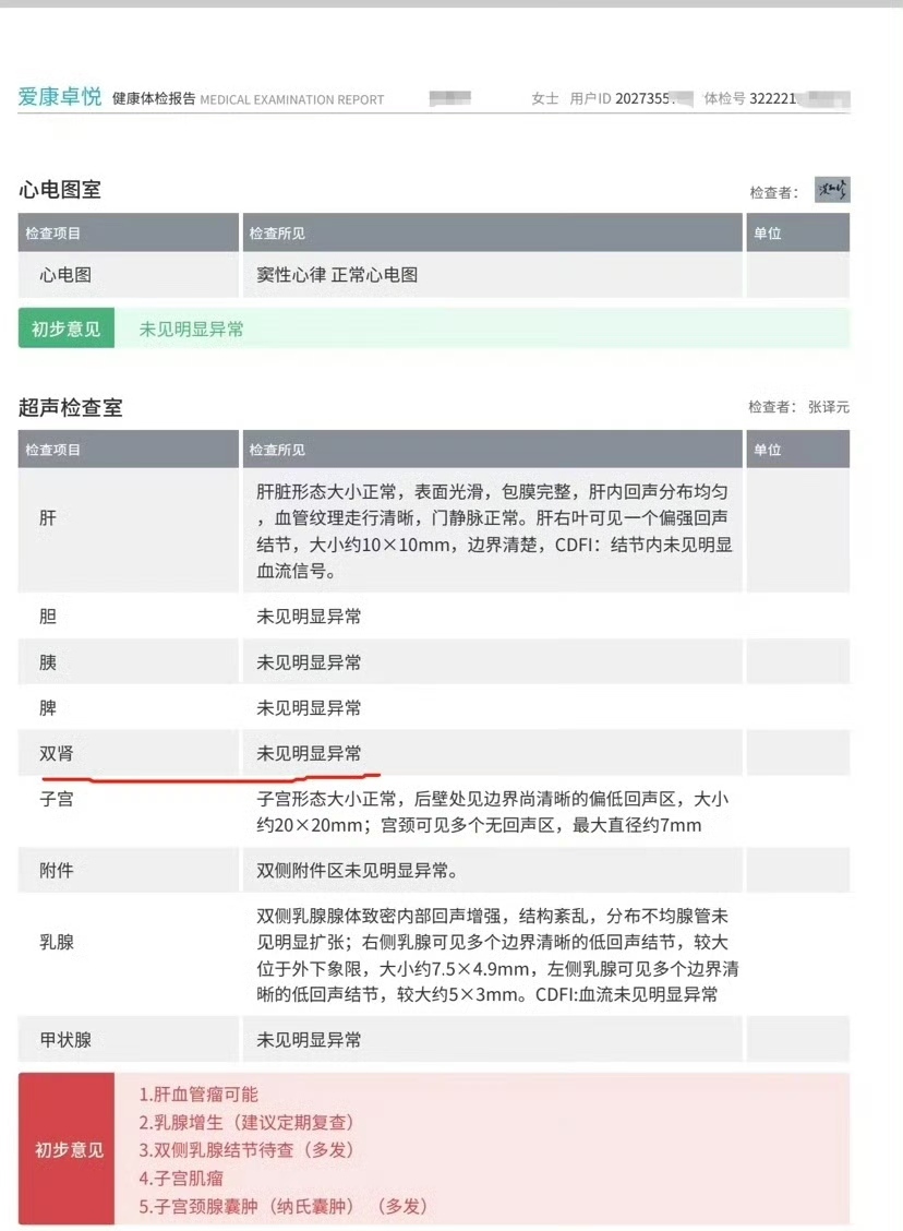 据张晓玲介绍,她连续10年在爱康国宾设于北京的分院进行体检。2022年之前的体检,她的双肾体检结果一直都是“未见明显异常”。2024年,她换了一家体检机构,结果在腹部彩色超声检查时被发现“右肾囊肿,右肾可见一低回声,大小:3.5cm×2.8cm,呈分叶状,血流信号丰富”,并被建议到医院进一步检查。