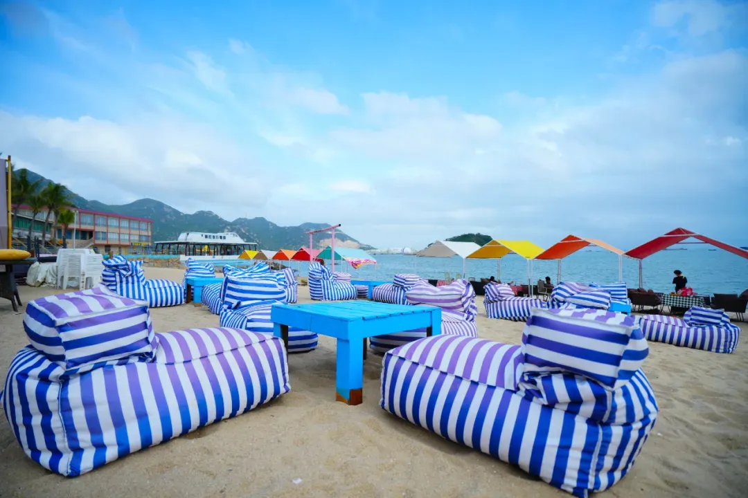 一旁伫立着整排彩色遮阳伞和沙发椅,